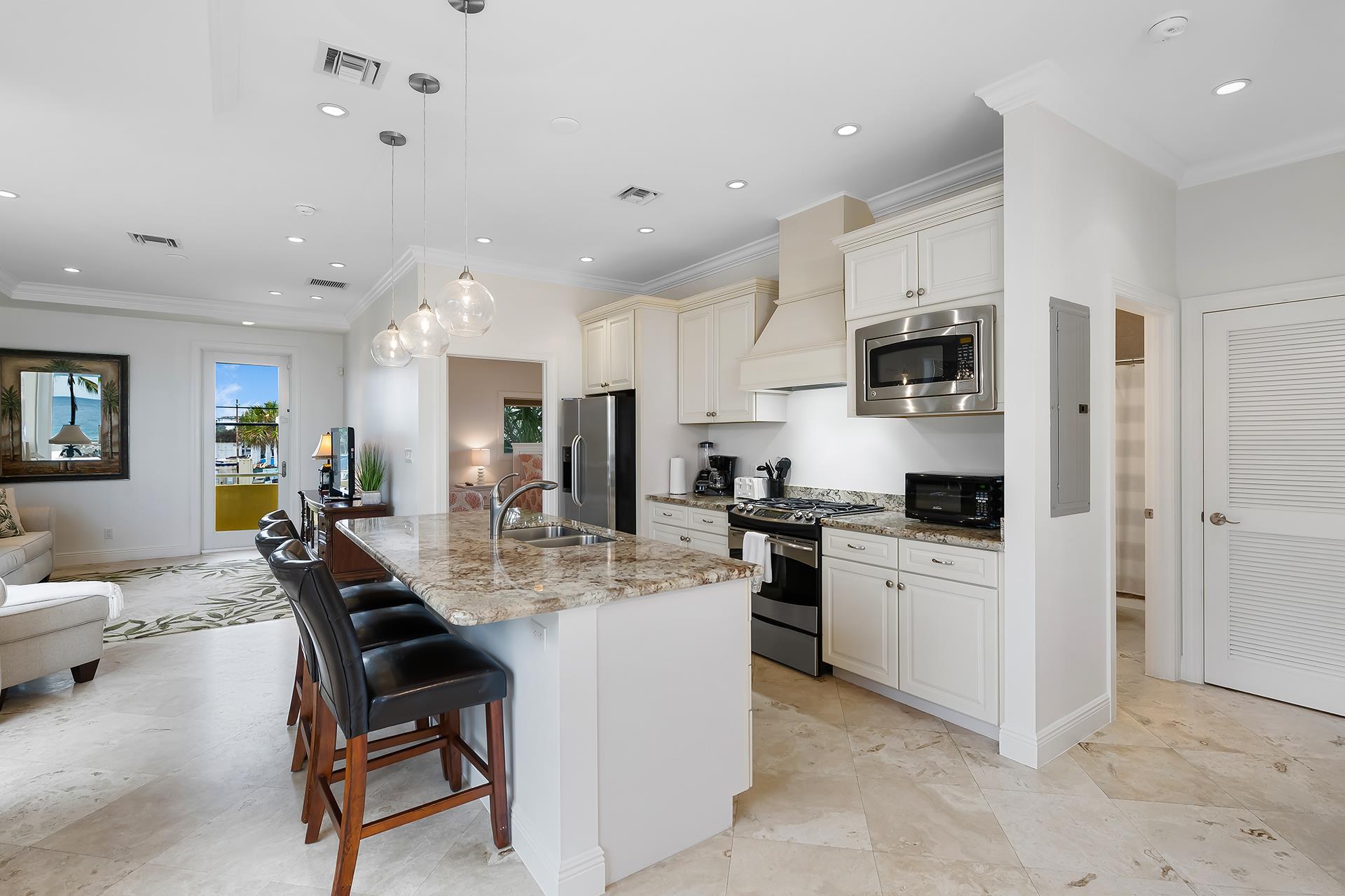 This vacation suite features breathtaking views, a private balcony, and a beautiful open living space. The unit is equipped with a full gourmet kitchen, a large living room, and floor to ceiling windows that allow an unbeatable ocean view. The custom kitchen features all of the appliances you’ll need for your stay with a gorgeous granite counter top that provides seating for three. You’ll also have the option of a formal dining area set for four. The master bedroom offers a queen size bed, double closets, and an en-suite. The second bedroom has one double bed and one twin bed as well as a walk-in closet. This unit is also equipped with its own stack-able washer/dryer.